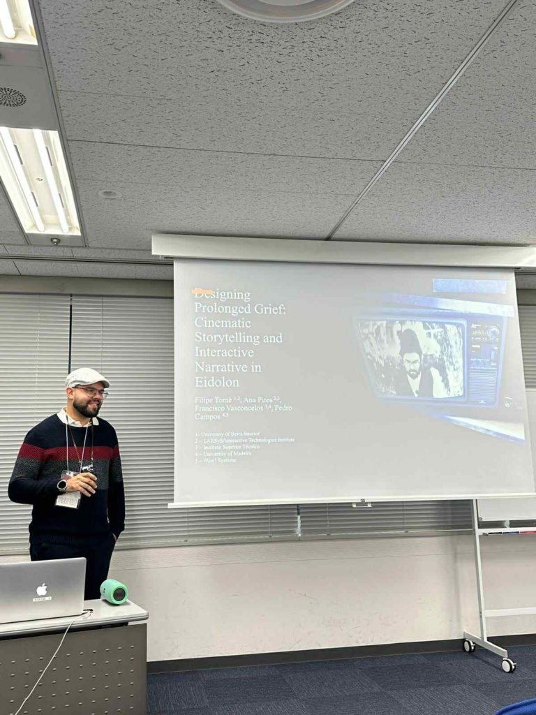 At KAMC 2025 in Kyoto, he presented the paper “Designing Prolonged Grief: Cinematic Storytelling and Interactive Narrative in Eidolon.” The project investigates how video games can explore Prolonged Grief Disorder (PGD) through a hybrid narrative that combines cinematic aesthetics, digital interaction, and AI-driven memory reconstruction. Eidolon is a first-person psychological thriller inspired by the five stages of grief and films such as Eternal Sunshine of the Spotless Mind and Manchester by the Sea. The story follows a protagonist trapped in an AI-generated dream simulation, with visual metaphors, escape-room-inspired puzzles, and time-based tension shaping the gameplay. The game uses Unreal Engine’s MetaHuman framework alongside live-action footage. Preliminary playtesting with 20 participants suggests that players reflected on their own experiences of loss. The paper was authored by Filipe Tomé, Ana Pires, Francisco Vasconcelos, and Pedro F. Campos.